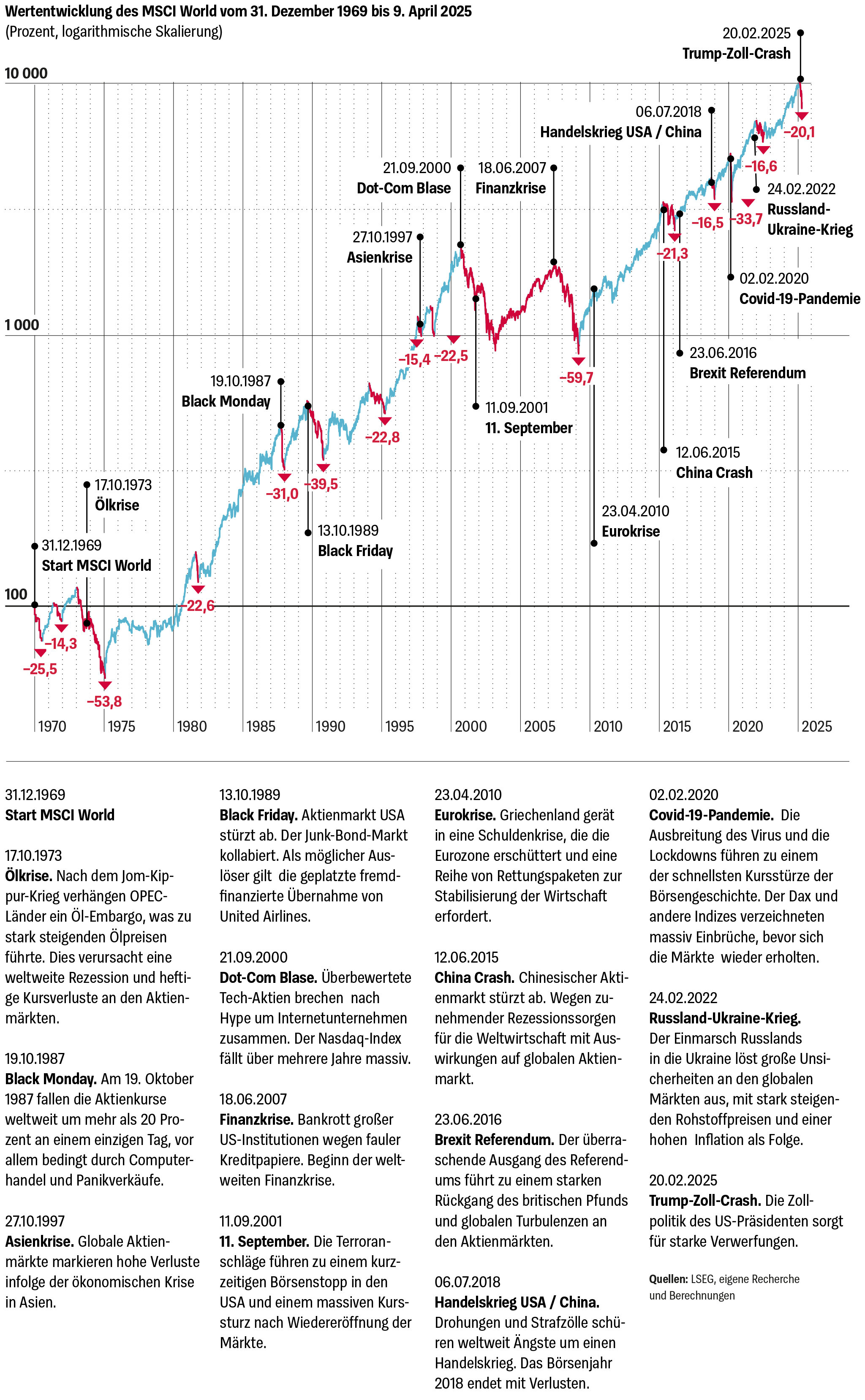 Das 21. Jahrhundert startete mit dem Platzen der Dotcom-Blase. Der MSCI World Index hatte sich von den Verlusten noch nicht wieder erholt, als die Finanzkrise hereinbrach. Besonders gut in Erinnerung dürfte Anlegerinnen und Anleger der Crash zu Beginn der Corona-Pandemie sein, der heftig war, aber in Rekordzeit auch wieder zu Ende. Der von Trumps Zollankündigungen ausgelöste Crash hat jetzt schon (Stand 10.4.25) für ein größeres Minus gesorgt als der Kurseinbruch zu Beginn des Russland-Ukraine-Krieges.