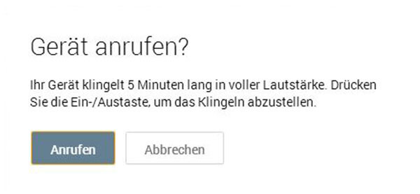 Wer sein Smartphone nicht am vermuteten Platz findet, wird in der Regel erst mal seine eigene Telefonnummer anrufen. Erfahrungsgemäß klingelt es dann oft in unmittelbarer Nähe – weil das Smartphone nur verlegt worden ist. Wenn er kein anderes Telefon zur Hand hat, kann der Nutzer mithilfe des Android Gerätemanagers das vermisste Smartphone fünf Minuten lang klingeln lassen – über die Funktion „klingeln lassen“.