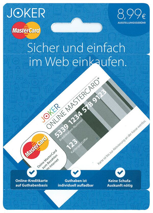 Die Joker Online Mastercard kostet 8,99 Euro im ersten Jahr, danach 7,99 Euro. Sie muss online mit den persönlichen Daten freigeschaltet werden. Die Pappkarte ohne Chip ist mit maximal 100 Euro im Monat aufladbar und kann nur für Online-Zahlungen genutzt werden. Geldabheben und Bezahlen im Laden sind nicht möglich. Herausgeber ist die Novum Bank mit Sitz in Malta. Die Karte wird auch von anderen Händlern angeboten, zum Beispiel von der Tankstellen-Kette Aral und dem Lebensmittelhändler Tengelmann.