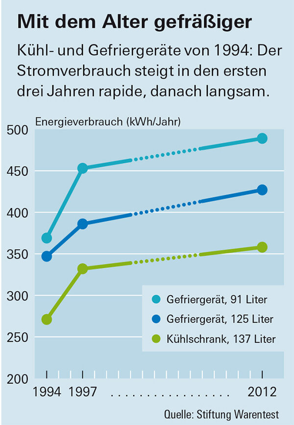 Schon im Jahr 2011 stellten die Tester der Stiftung Warentest fest, dass billigere Kühlschränke auf Dauer teuer kommen. Im Rahmen einer Langzeituntersuchung machten die Prüfer nun noch eine andere interessante Beobachtung: Der Stromverbrauch von Kühl- und Gefriergeräten steigt im Laufe ihrer Lebenszeit kontinuierlich an. Die Tester haben bei drei im Jahr 1994 geprüften Kühl- und Gefriergeräten nach 3 und nach 18 Jahren erneut den Stromverbrauch gemessen. Erstaunliches Ergebnis: Er ist in dieser Zeit bei allen Geräten um 20 bis 30 Prozent angestiegen.