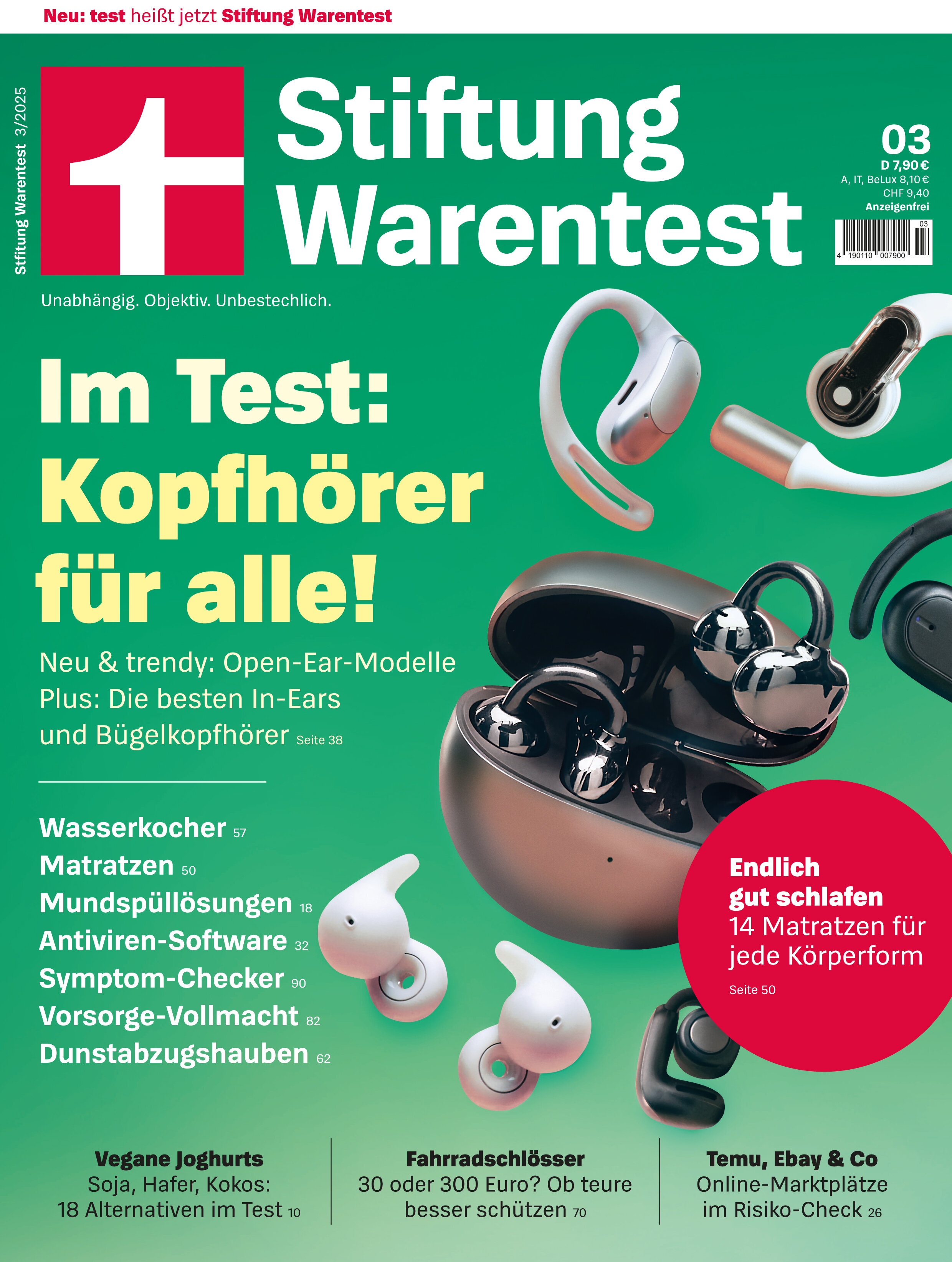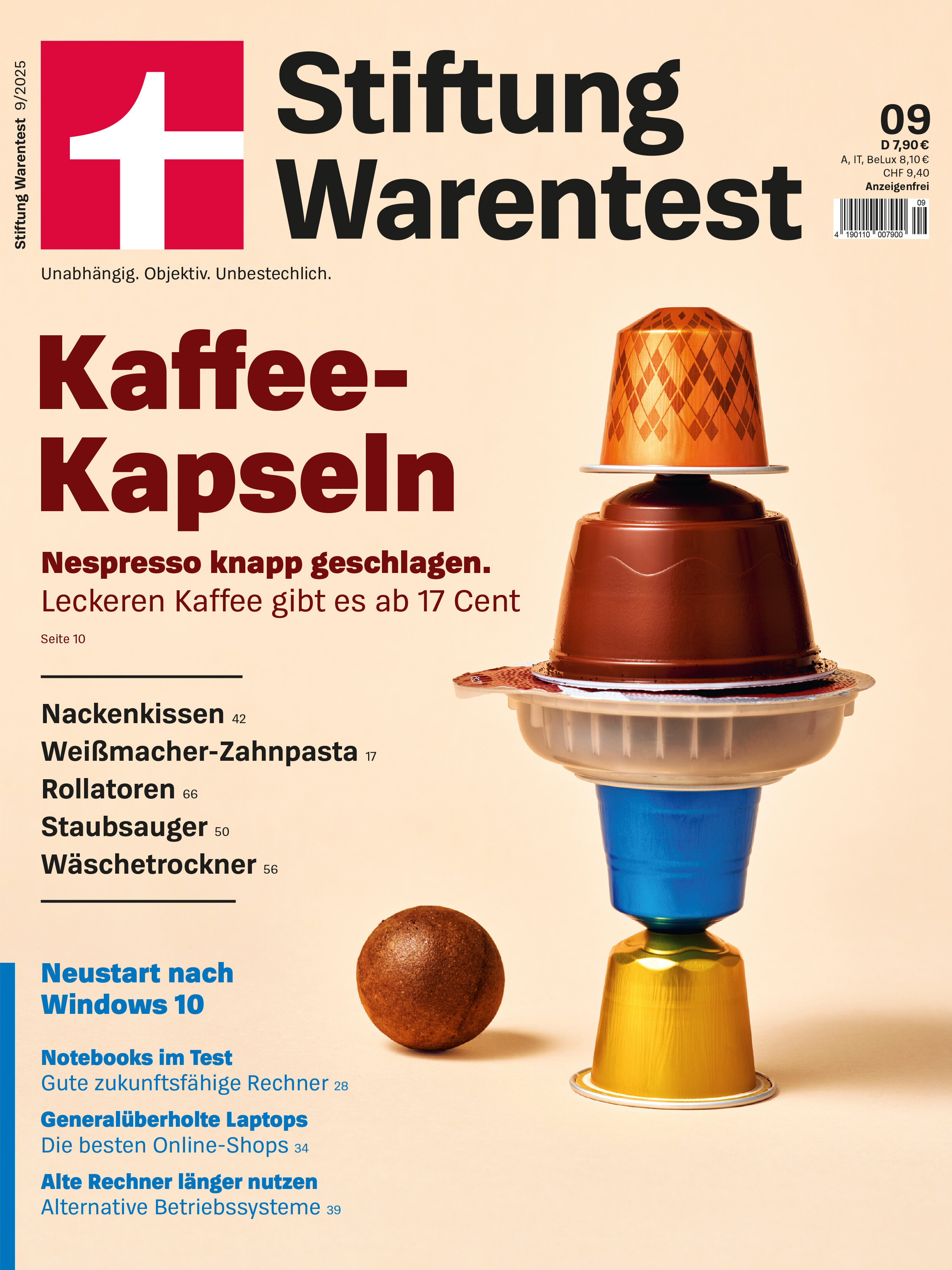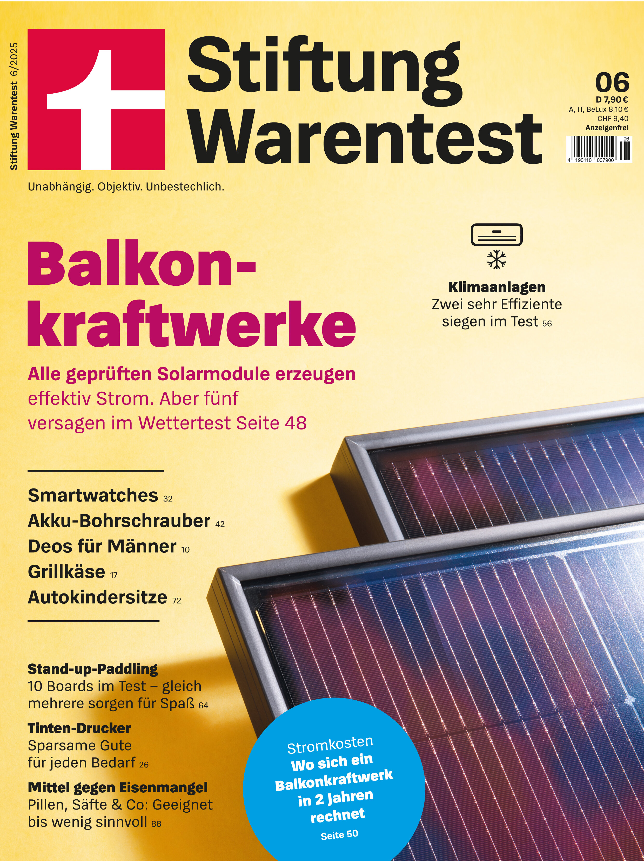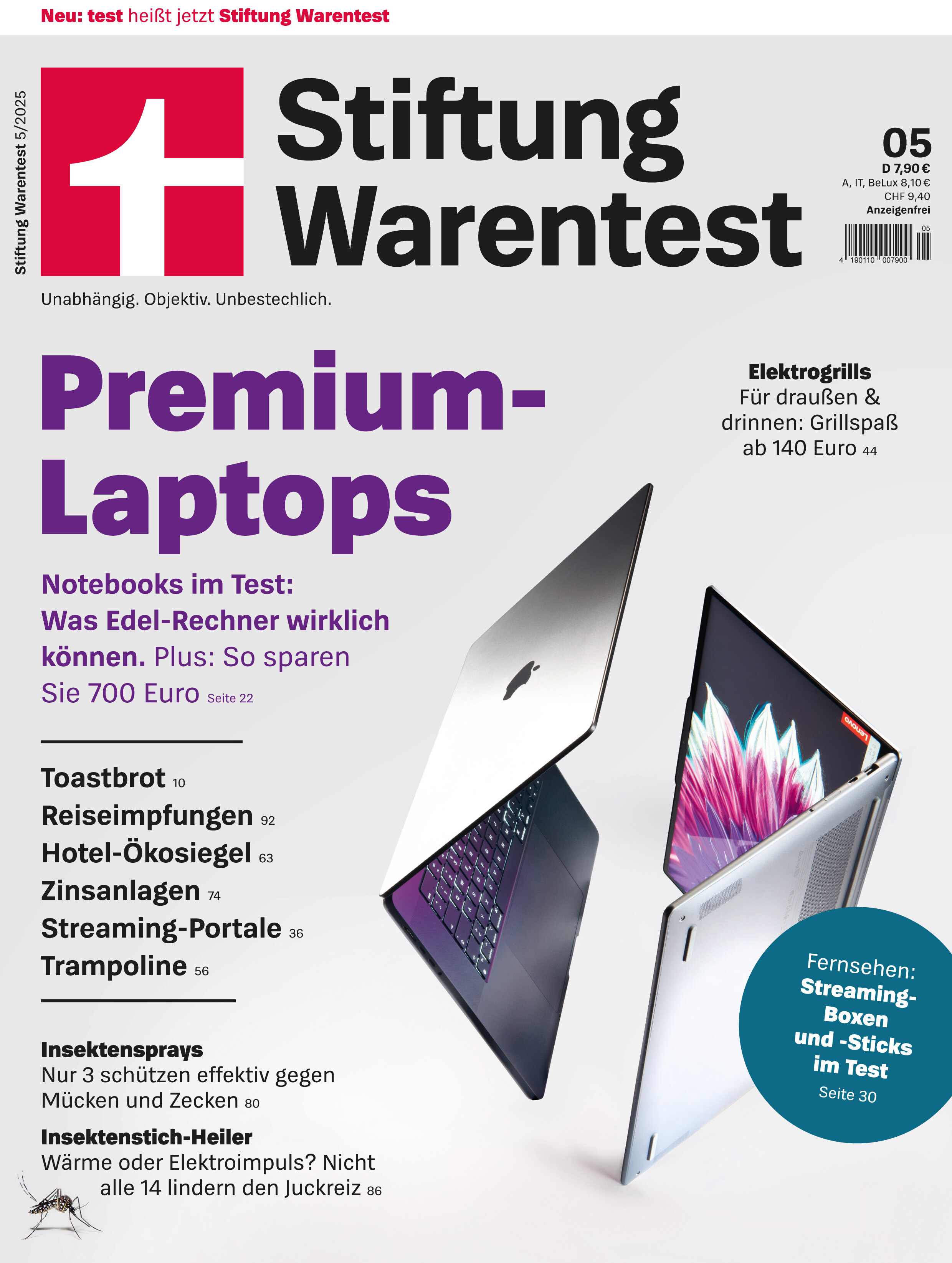Die Verwendung von Bild- und Videomaterial ist ausschließlich bei redaktioneller Berichterstattung über das jeweilige Thema zulässig, soweit unsere rechtlichen Hinweise beachtet werden. Dann ist die Verwendung unter Angabe der Quelle „Stiftung Warentest“ honorarfrei. Bei Online-Verwendung muss auf den zugehörigen Inhalt auf test.de verlinkt werden. Eine werbliche oder gewerbliche Nutzung ist nicht gestattet.