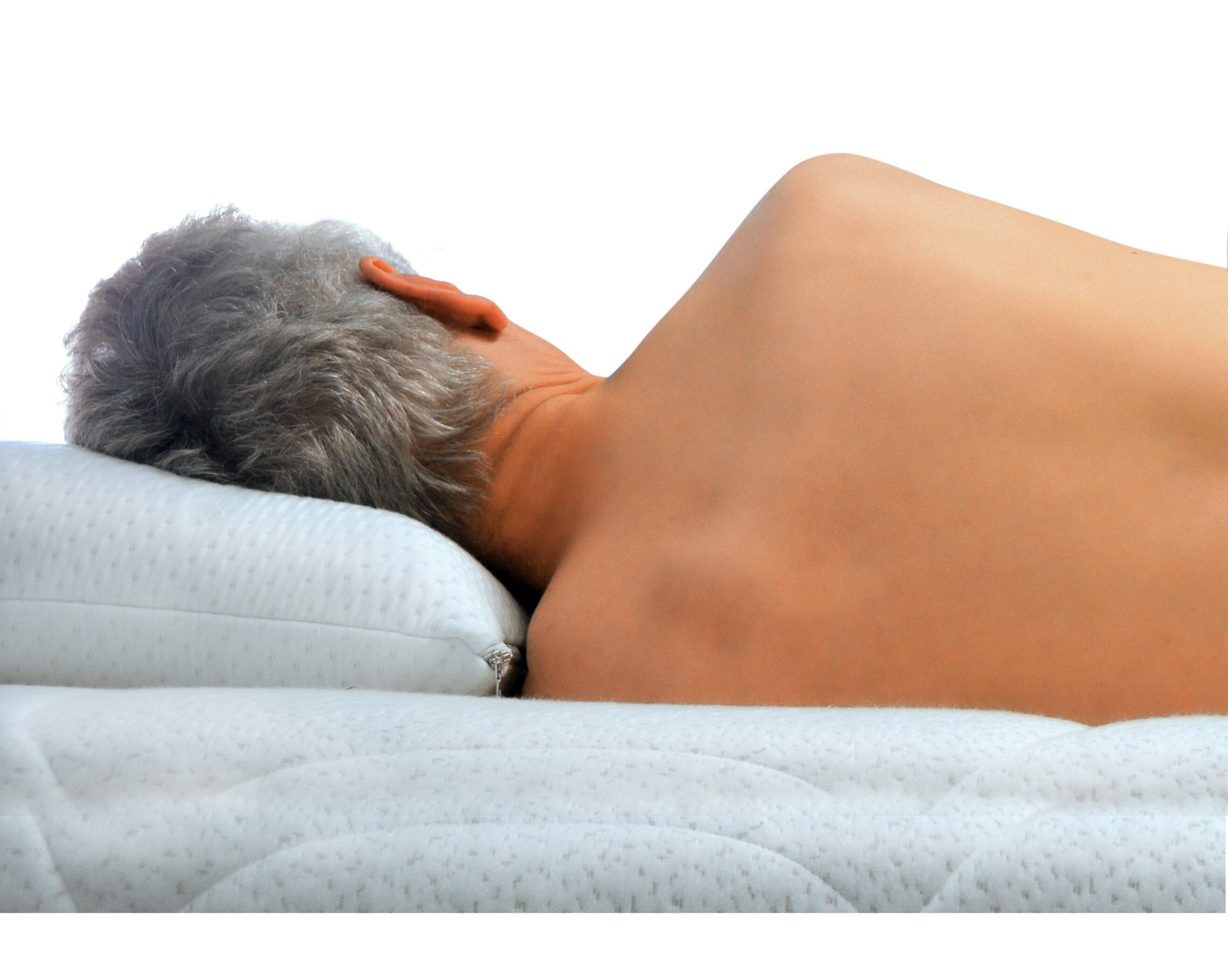 Matratzen und Kissen stützen unseren Probanden nicht optimal. Seine Halswirbelsäule knickt seitlich ab.