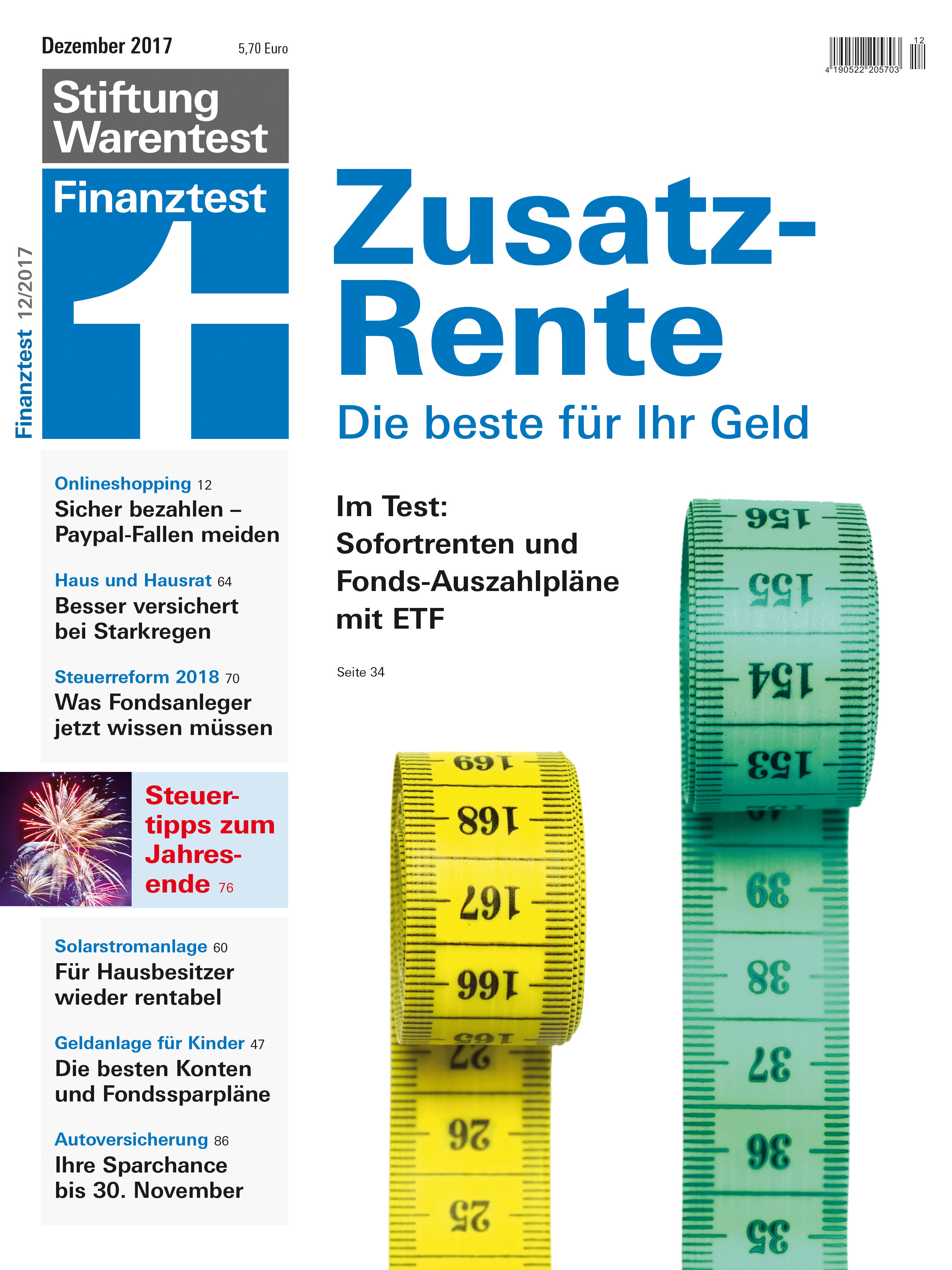 Finanztest zeigt in seiner Dezember-Ausgabe, mit welcher Zusatzrente Sparer mit Sofortrenten oder Auszahlplänen rechnen können und unterstützt Ruheständler mit hilfreichen Checklisten und Schritt-für-Schritt-Anleitungen. Online ist der Test unter www.test.de/zusatzrente abrufbar.